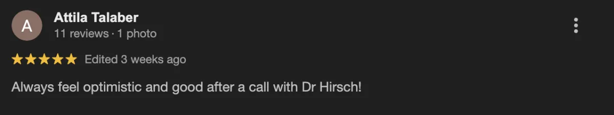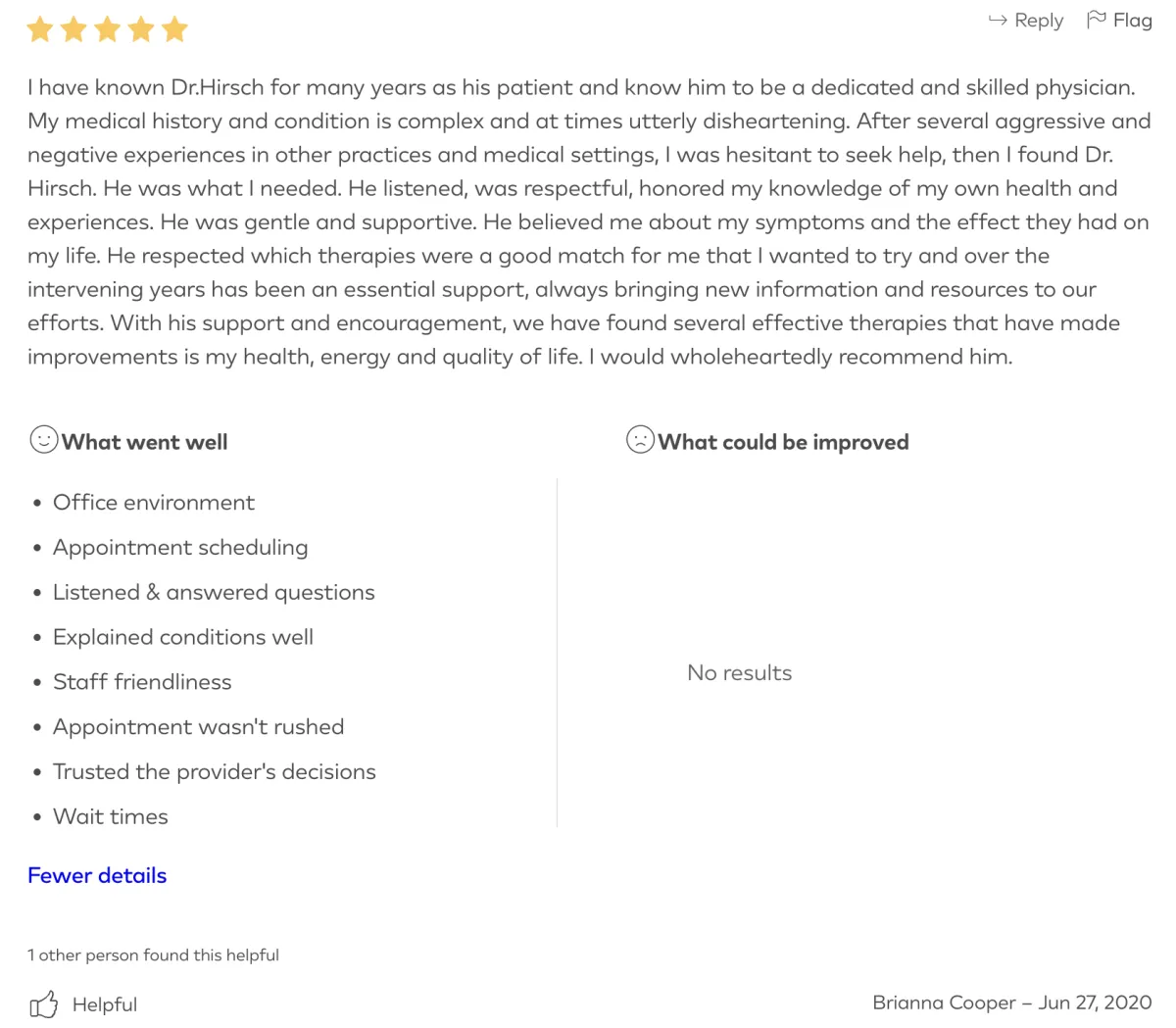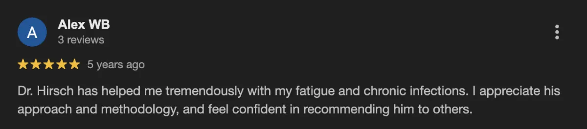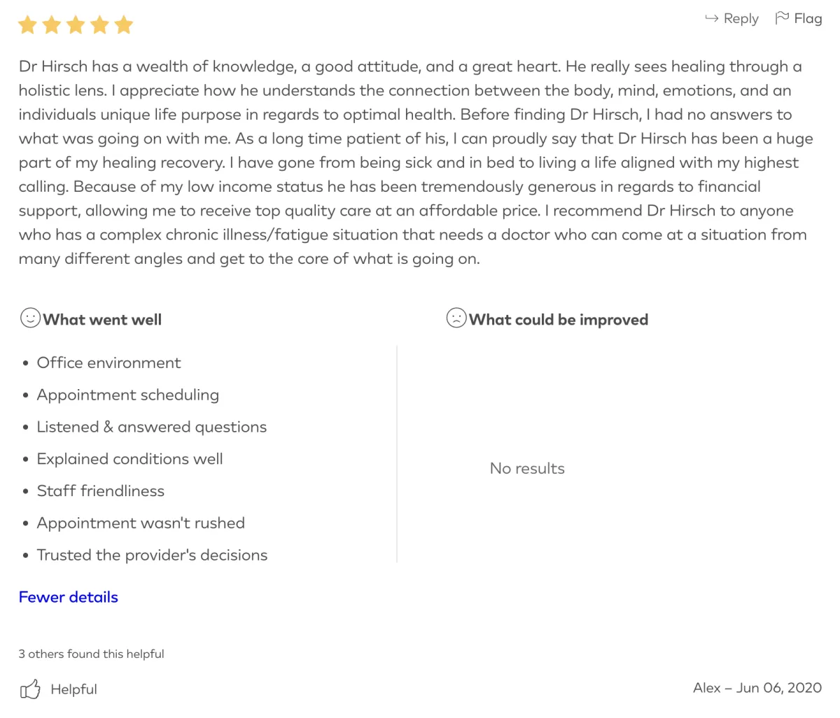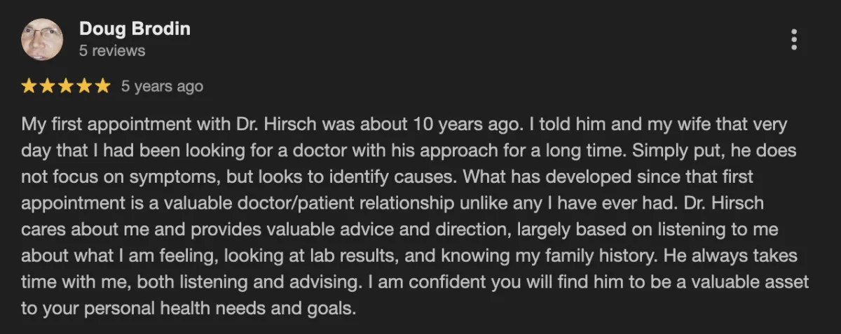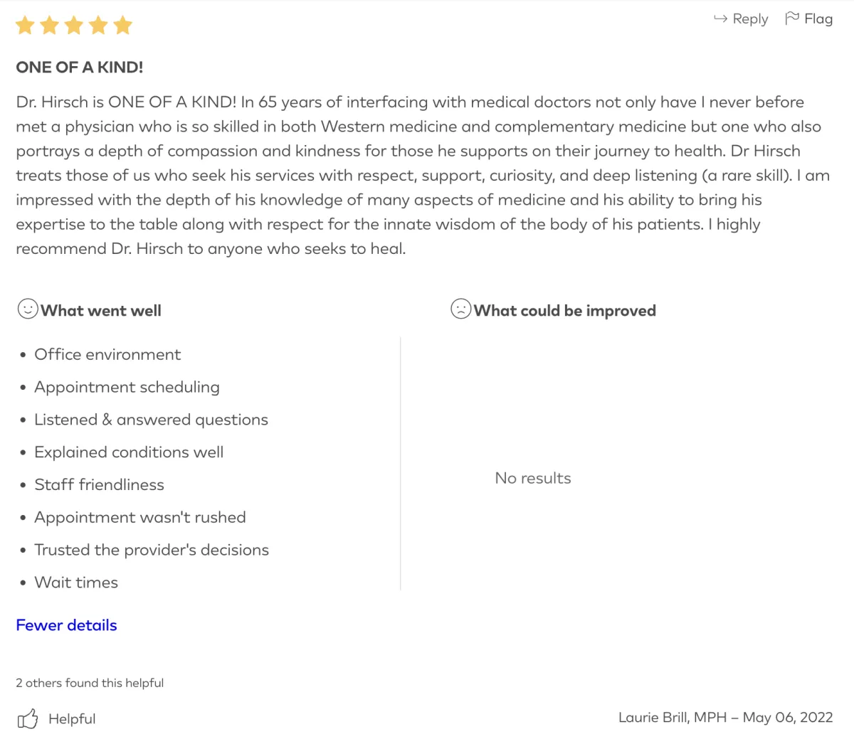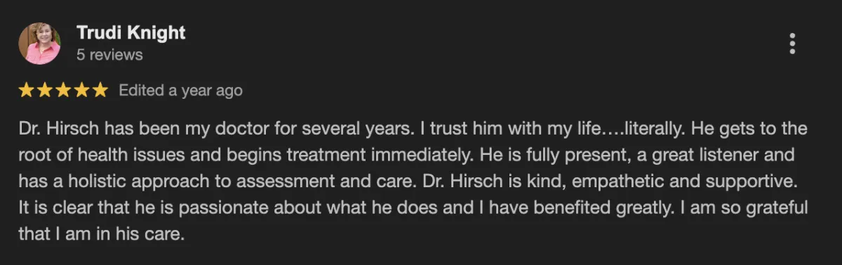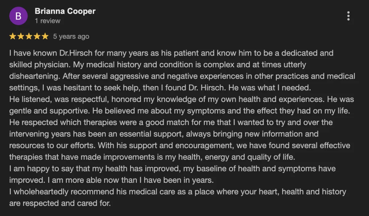 Hirsch is knowledgeable, patient, and professional. He approached my numerous symptoms in a full spectrum way with a structured step-by-step plan that was gentle on my body and improved my quality of life drastically.