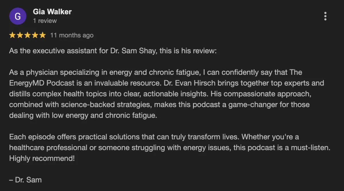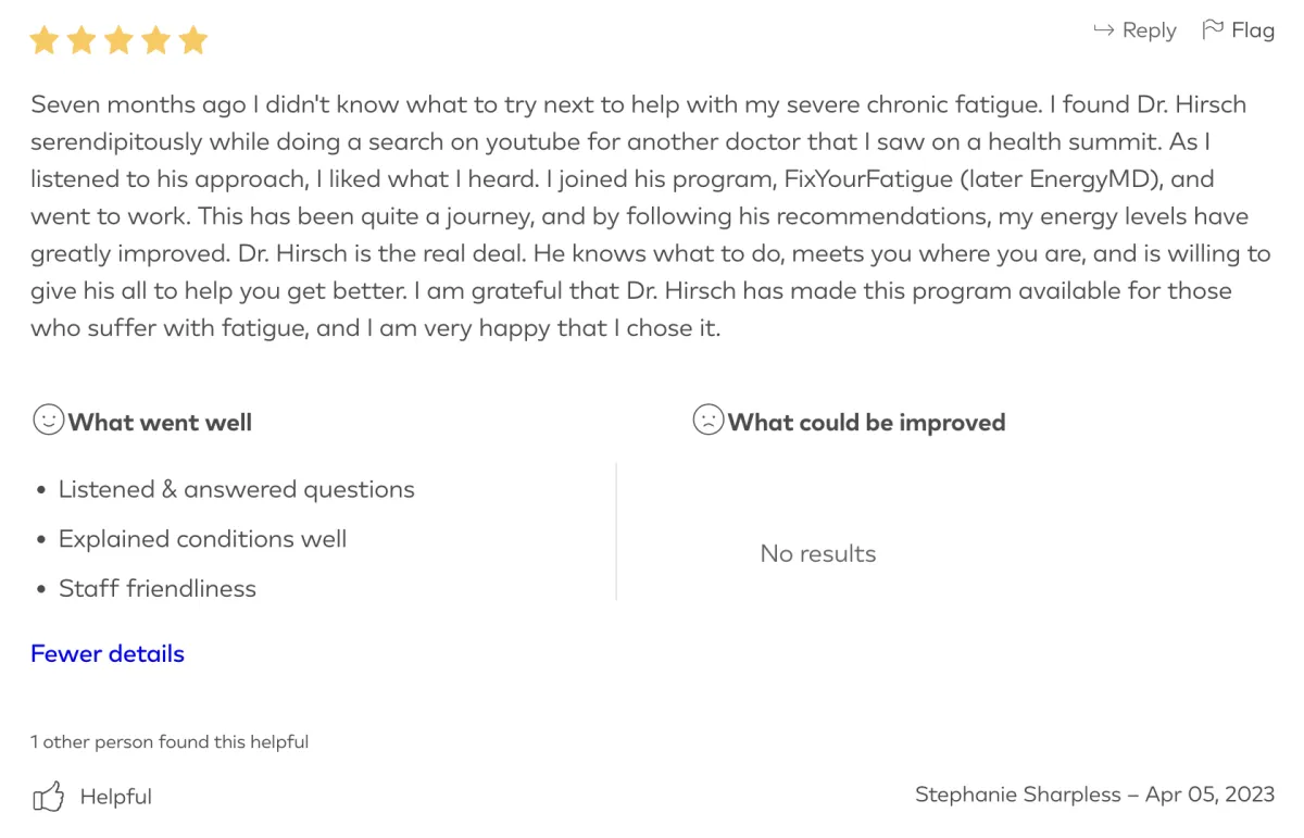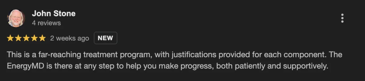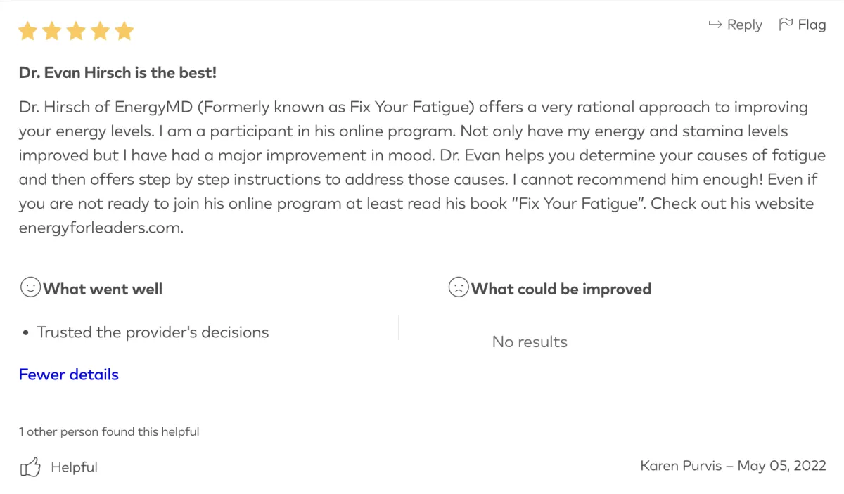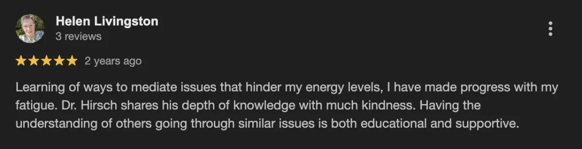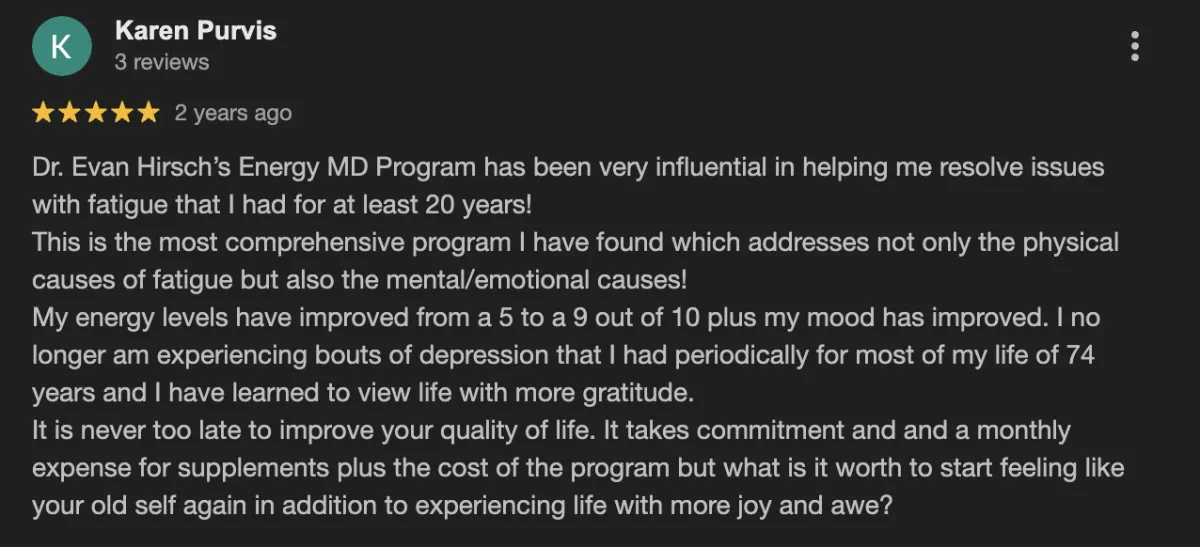 Evan Hirsch’s Energy MD Program has been very influential in helping me resolve issues with fatigue that I had for at least 20 years!