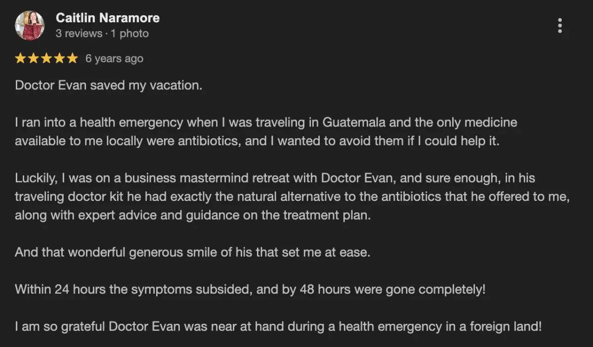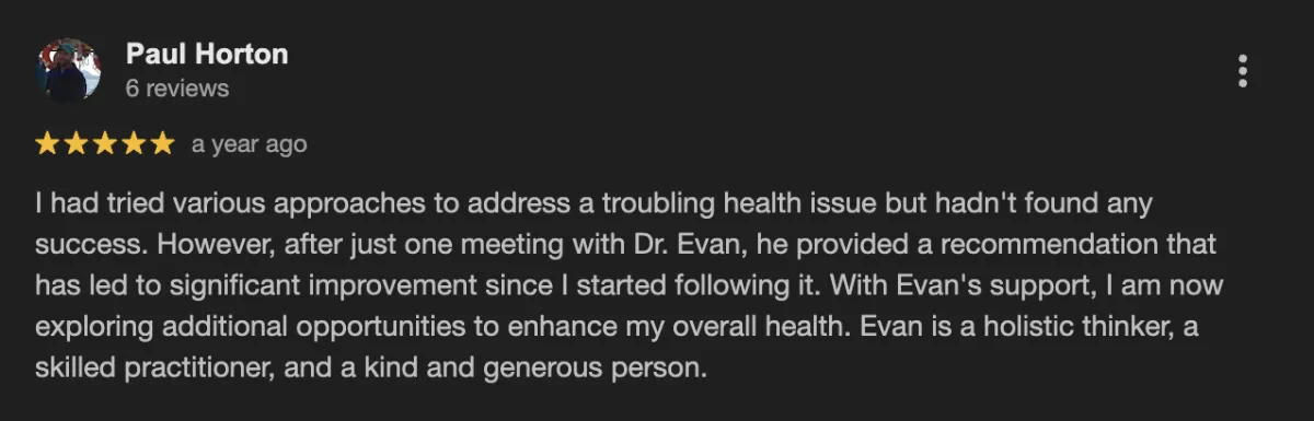 I spent 5 years as a patient of Evan. I learned a lot about my bodily functions and lifestyle habits affecting my health and well being. Evan knows functional medicine inside and out and has to ability to communicate its benefits to his patients. He will get to the root cause of your illness and certainly did for me. His healing modalities and protocols are top of the line in the functional medicine world.