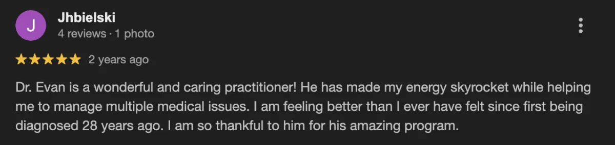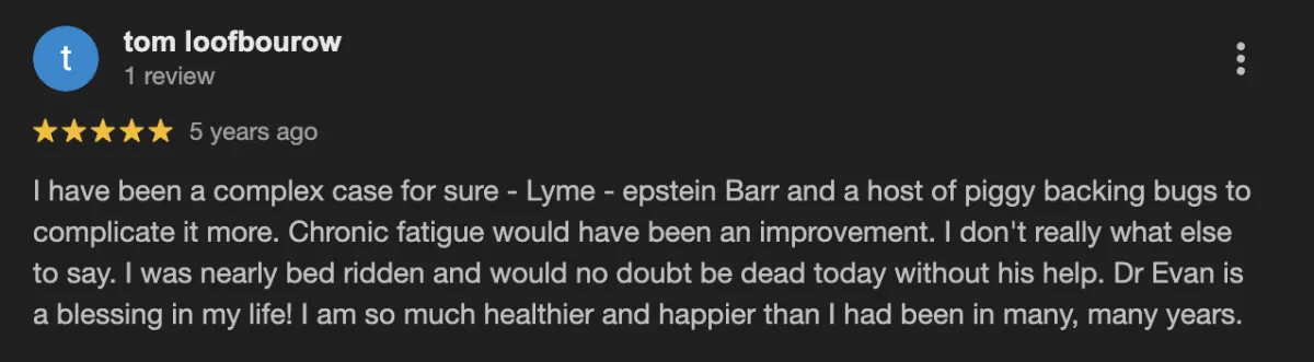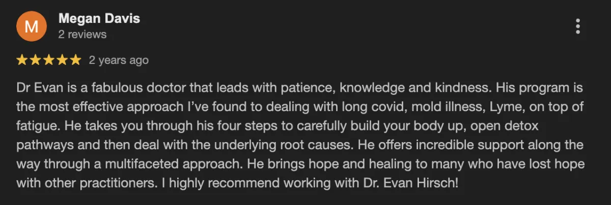 Evan is a fabulous doctor that leads with patience, knowledge and kindness. His program is the most effective approach I’ve found to dealing with long covid, mold illness, Lyme, on top of fatigue.