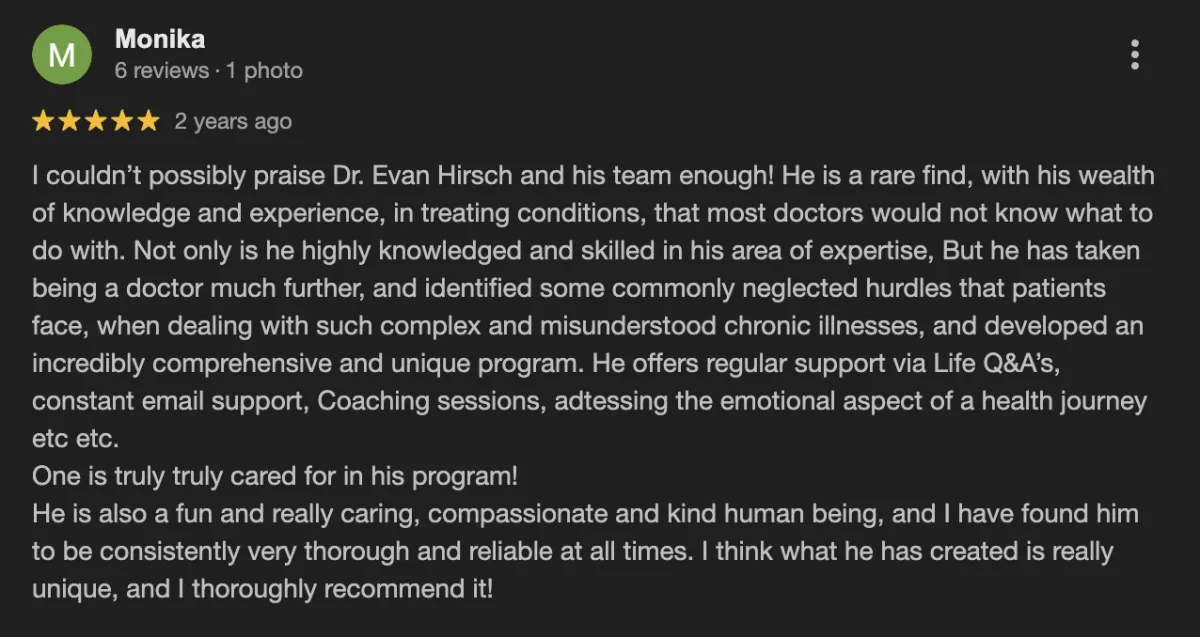I couldn’t possibly praise Evan Hirsch and his team enough! He is a rare find, with his wealth of knowledge and experience, in treating conditions, that most doctors would not know what to do with.