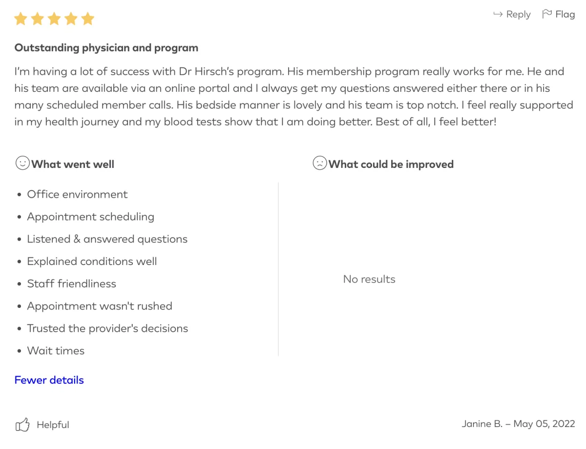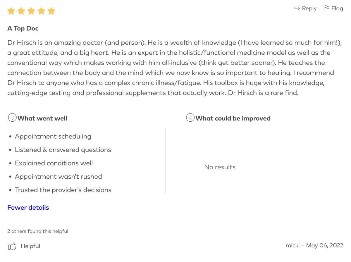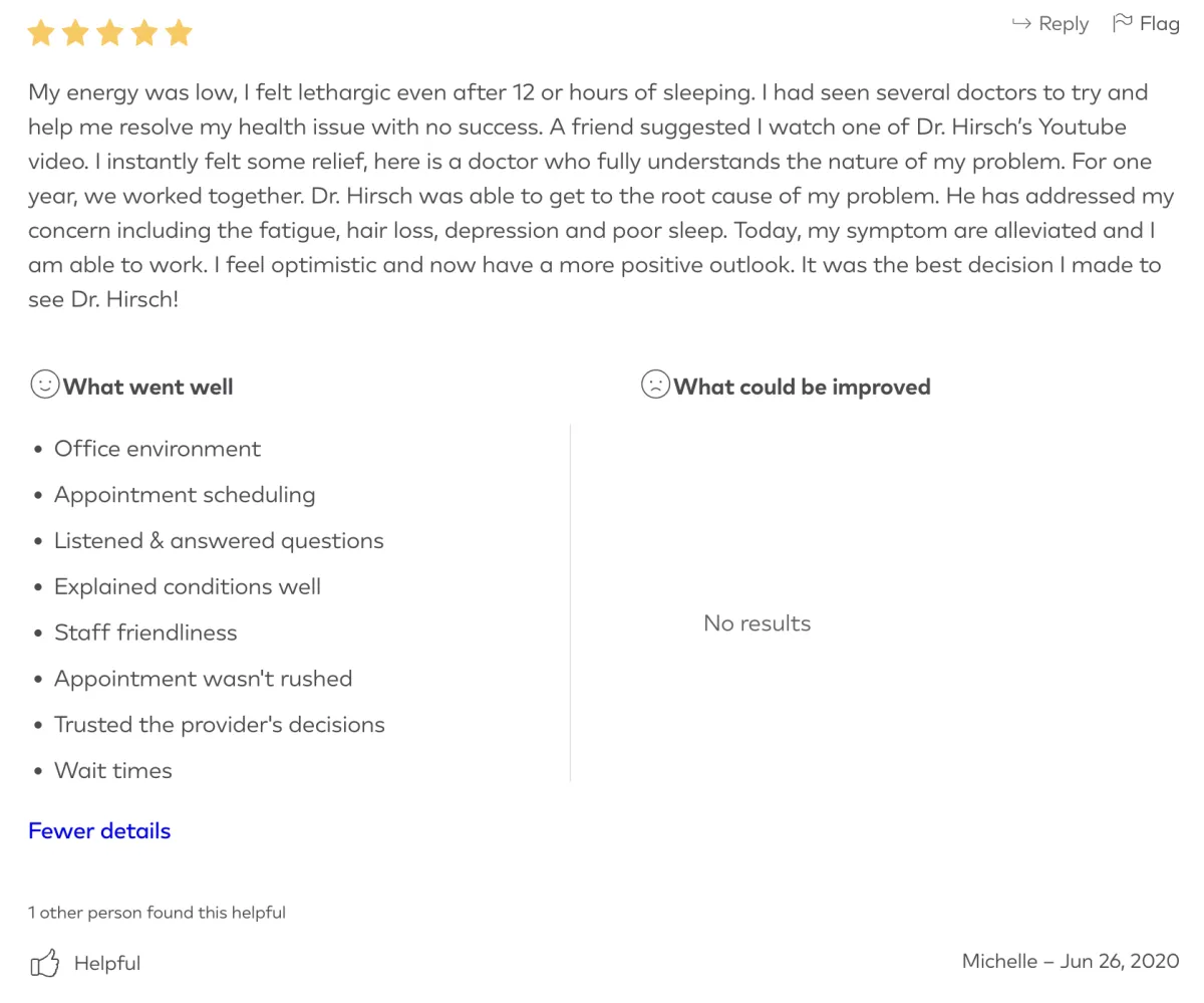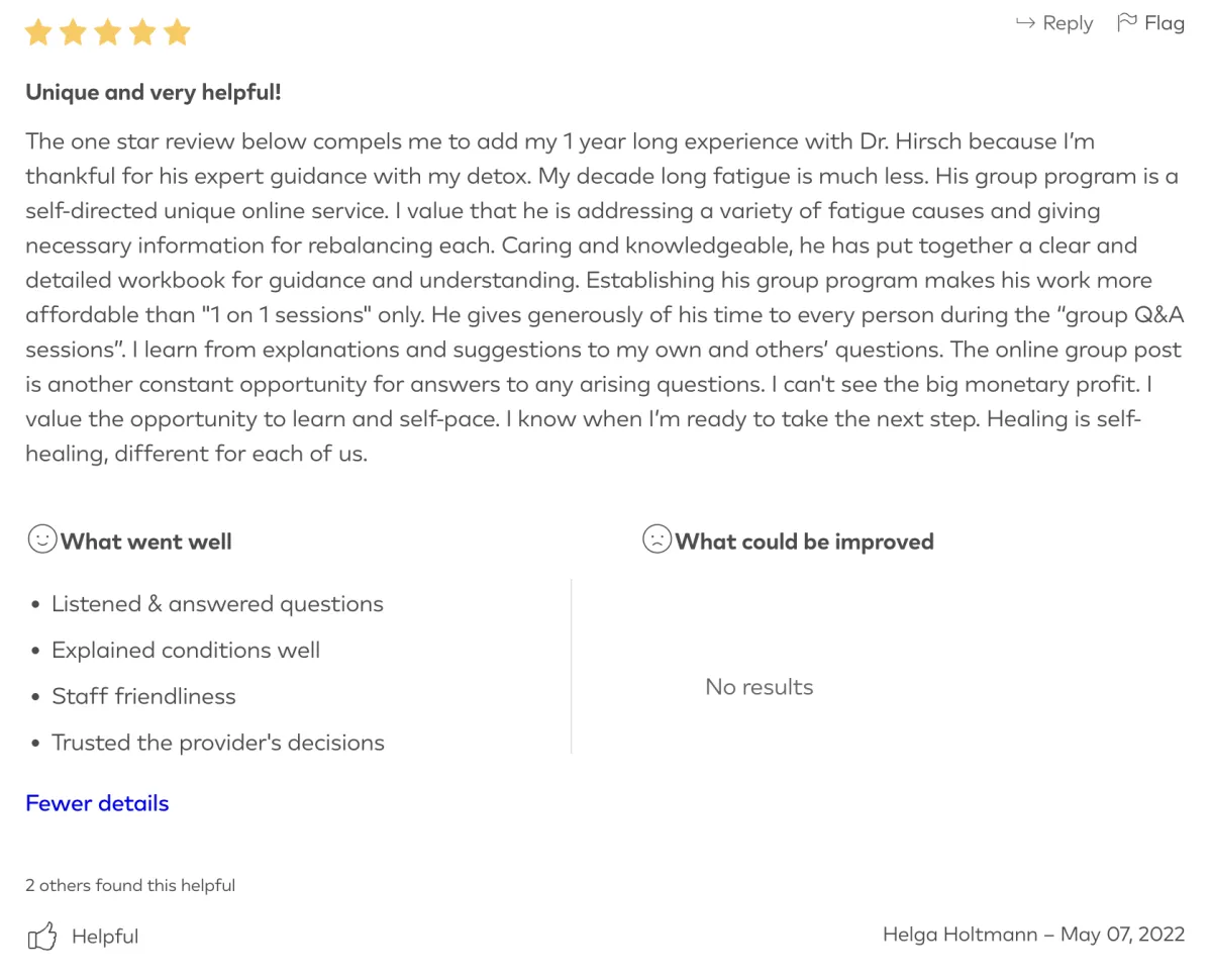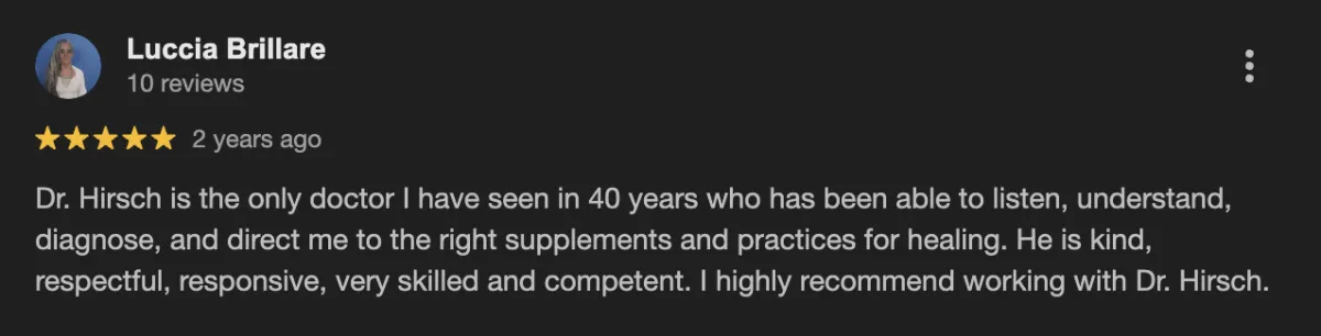 Hirsch is the only doctor I have seen in 40 years who has been able to listen, understand, diagnose, and direct me to the right supplements and practices for healing.