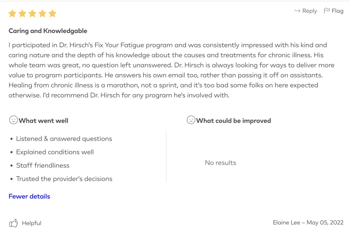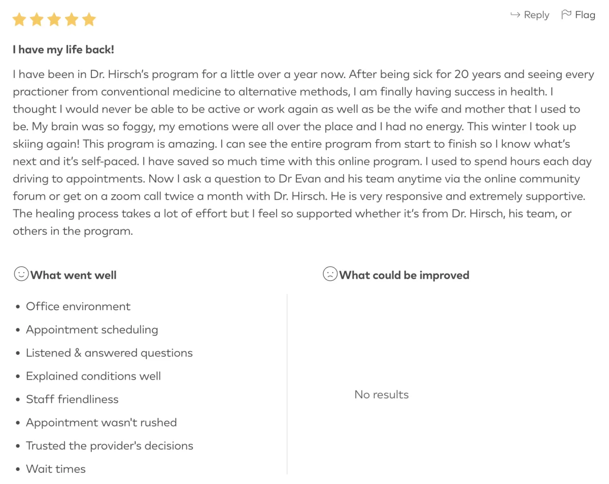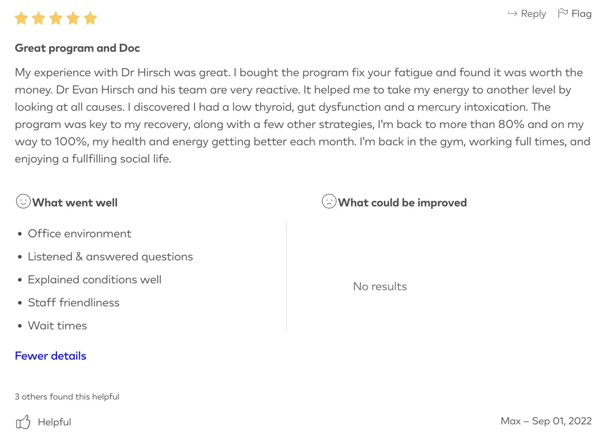 My experience with Evan was great. I bought the program fix your fatigue and found it was worth the money. Evan Hirsch and his team are very reactive. It helped me to take my energy to another level by looking at all causes. I discovered I had a low thyroid, gut dysfunction and a mercury intoxication.